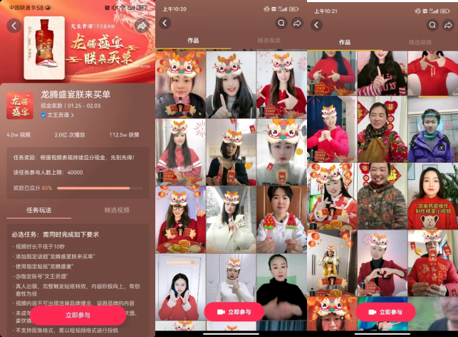 在1月25日-2月3日抖音短视频平台,文王贡酒发起了#龙腾盛宴朕来买单 主题全民挑战赛,引发超4万人热情参与,视频总播放量突破2.1亿。