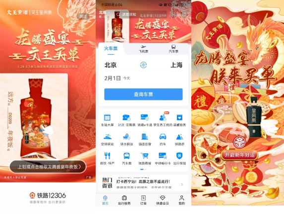 此次春节营销,文王贡酒联合中国铁路12306 APP、抖音、新浪微博、微信四大平台,覆盖多元场景,在合作形式上做到媒体势能最大化,全方位助力“龙腾盛宴 朕来买单”主题活动的全线引爆。