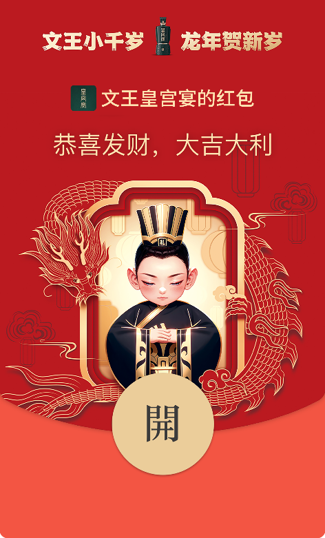 此次龙年来临之际,代表文王贡酒旗下高端产品“皇宫宴”的卡通形象“小千岁”隆重登场,作为品牌新年红包封面,以皇家帝王之相完美呼应龙年的尊贵,为千家万户送出最诚挚的龙年祝福。通过朋友圈广告精准触达安徽用户,抢先拥有这份满满的过年仪式感。独树一帜的设计让品牌在众多红包中脱颖而出,通过私域的分享扩散,将品牌触达更强的社交关系网,大大提升了春节营销的传播效果。